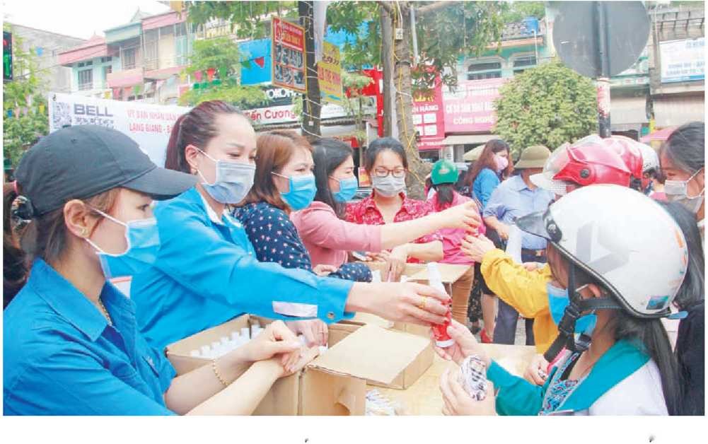 Đoàn thanh niên thị trấn Vôi (Lạng Giang) tặng khẩu trang, nước rửa tay cho người dân địa phương