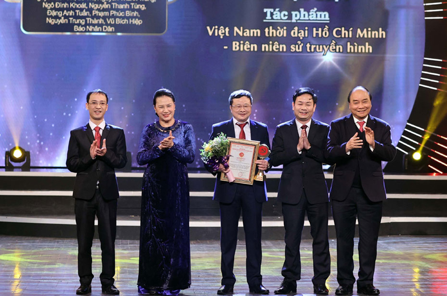 Thủ tướng Nguyễn Xuân Phúc và Chủ tịch Quốc hội Nguyễn Thị Kim Ngân trao Giải Đặc biệt cho nhóm tác giả của Báo Nhân dân với tác phẩm " Việt Nam thời đại Hồ Chí Minh - Biên niên sử truyền hình".