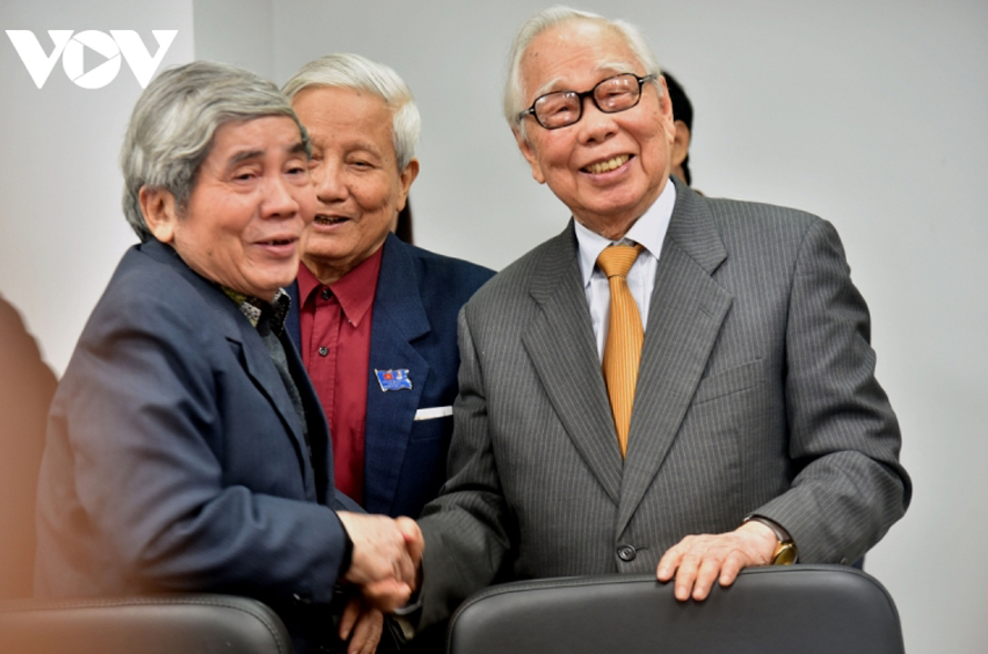 Nhà báo Phan Quang (bên phải) cùng các nhà giáo, nhà báo lão thành. (Ảnh: VOV)