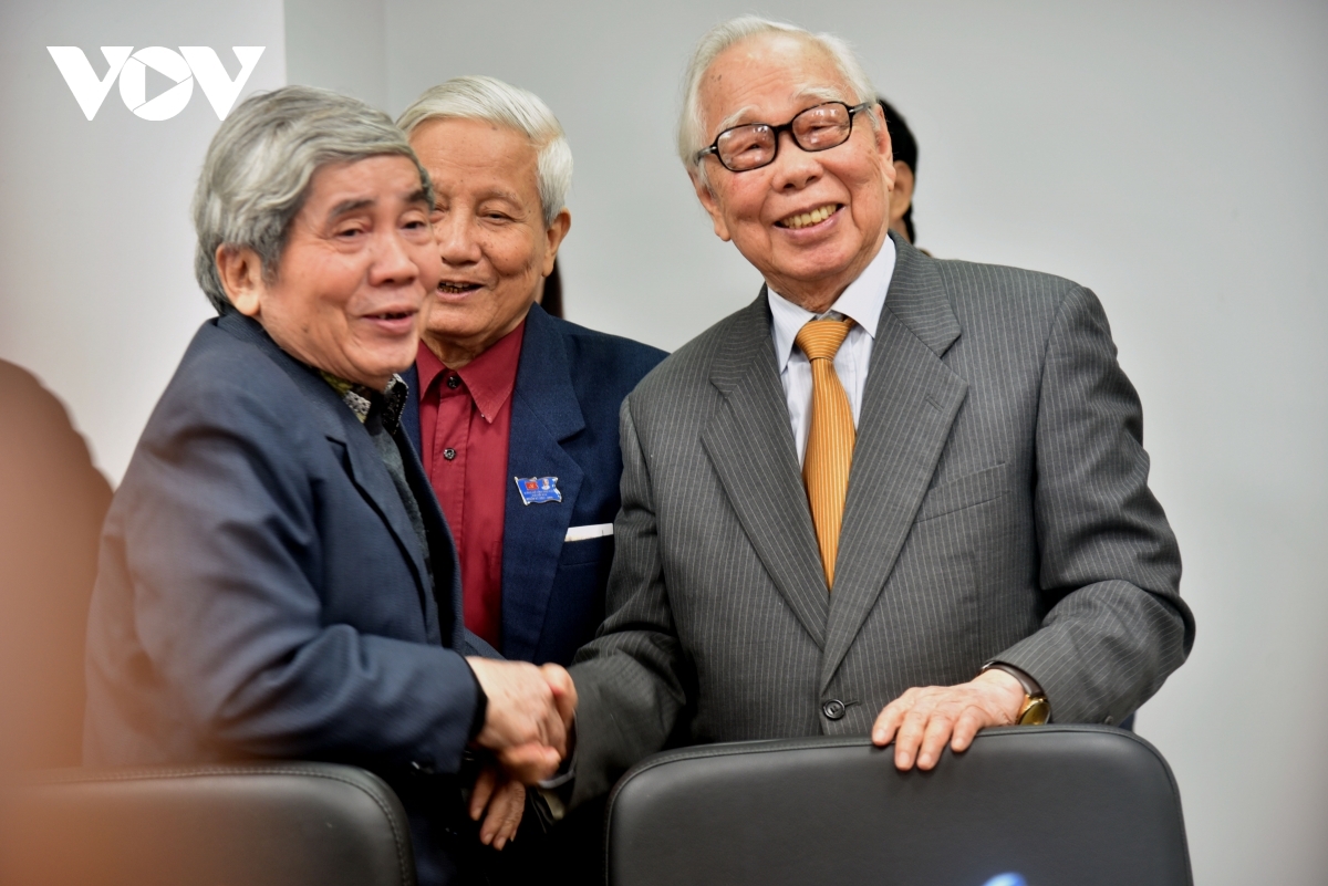 Nhà báo Phan Quang (bên phải) cùng các nhà giáo, nhà báo lão thành.