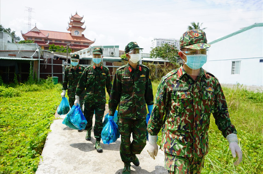 Lực lượng quân đội đến tận nhà tặng thực phẩm cho người dân Tp Hồ Chí Minh. Ảnh: LDO