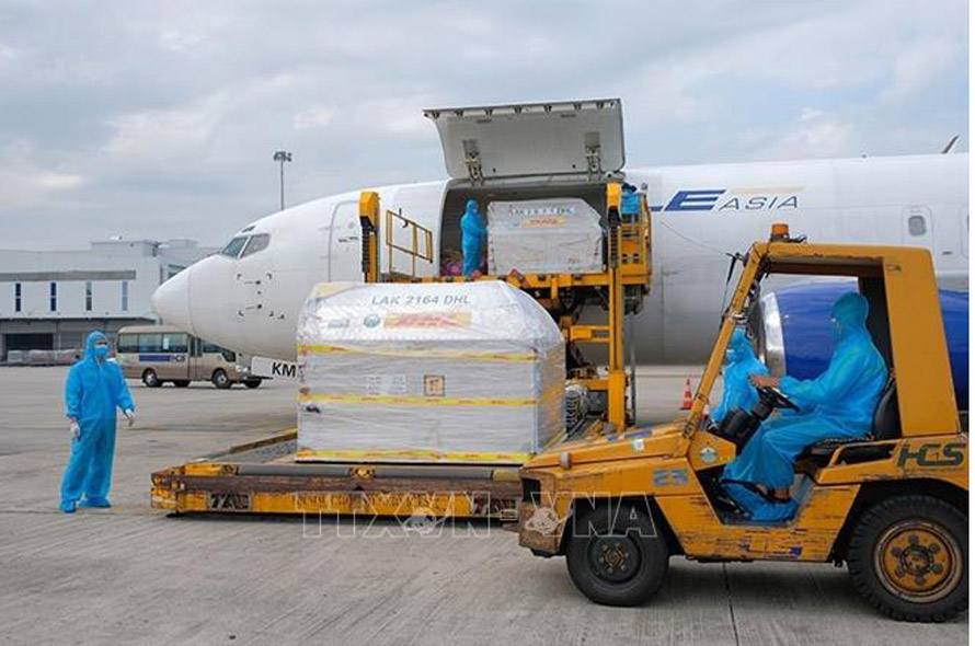 Lô vaccine phòng COVID-19 của Pfizer/BioNtech đầu tiên về đến Việt Nam, sáng 7/7. Ảnh: TTXVN