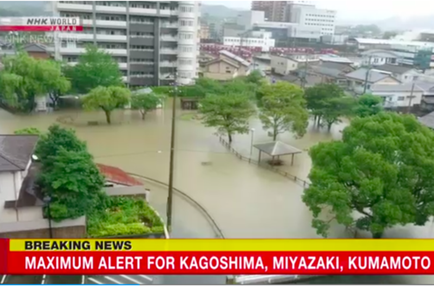 Nhật Bản đã phát cảnh báo mưa cấp cao nhất tại 3 tỉnh trên đảo Kyushu và ban bố yêu cầu sơ tán hơn 120.000 dân. Một số con sông ở tỉnh Kagoshima và Miyazaki hiện có nguy cơ gây ra lũ lụt.