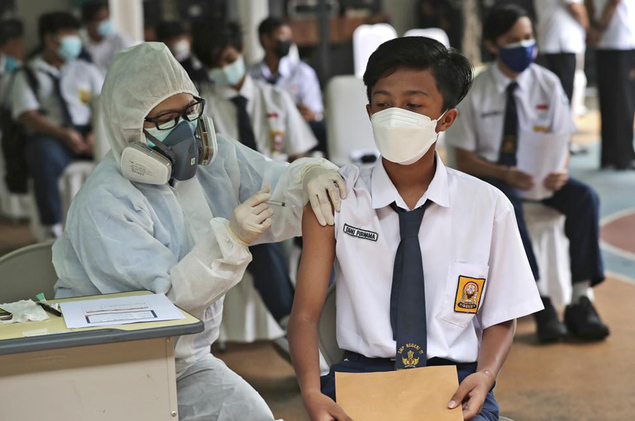 Nhân viên y tế tiêm vaccine COVID-19 cho học sinh tại Tangerang, Indonesia. Ảnh: AP
