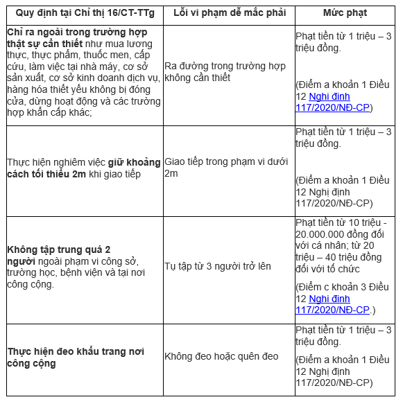 Ra đường không có lý do chính đáng, không đeo khẩu trang, không giữ khoảng cách 2m sẽ bị phạt 1-3 triệu đồng (theo điểm a, khoản 1, điều 12 nghị định 117 xử phạt vi phạm hành chính trong lĩnh vực y tế). Các hành vi này vi phạm không thực hiện biện pháp bảo vệ cá nhân đối với người có nguy cơ mắc bệnh dịch theo hướng dẫn của cơ quan y tế.