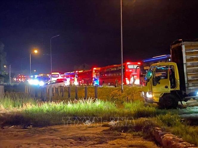 Hiện trường vụ tai nạn đặc biệt nghiêm trọng trên Quốc lộ 1A đoạn qua huyện Hàm Tân (Bình Thuận), gây ùn tắc nghiêm trọng. Ảnh: Nguyễn Thanh/TTXVN.