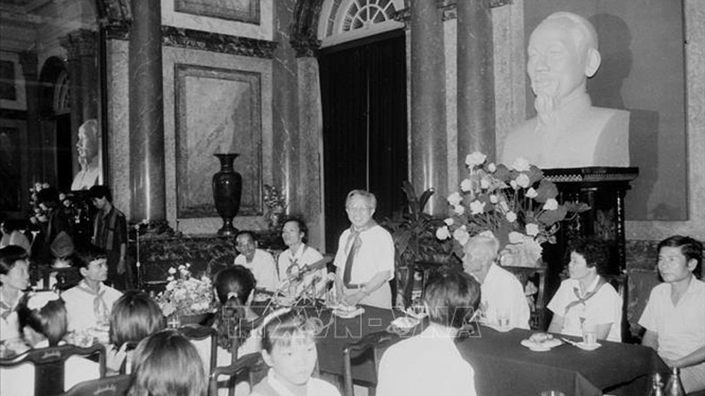 Chủ tịch Quốc hội Lê Quang Đạo gặp mặt và nói chuyện với thiếu nhi là con thương binh, liệt sĩ, học sinh xuất sắc của tỉnh Hà Tĩnh (22/7/1992). Ảnh: Xuân Tuân/TTXVN |