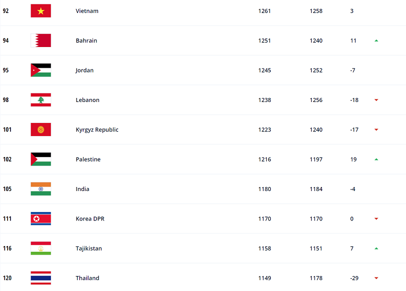 Đáng chú ý, đại kình địch của tuyển Việt Nam là Thái Lan tụt 14 bậc. "Voi chiến" hiện đứng thứ 120 thế giới với 1.149 điểm.