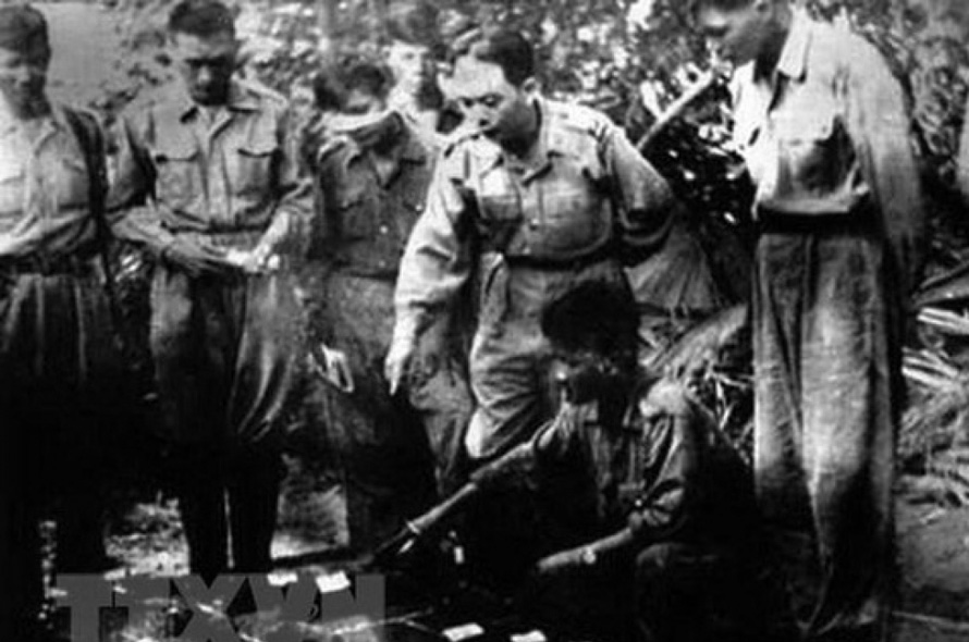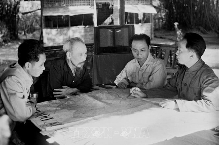Chủ tịch Hồ Chí Minh, Đại tướng Võ Nguyên Giáp cùng các đồng chí lãnh đạo Đảng và Nhà nước bàn kế hoạch mở chiến dịch Điện Biên phủ năm 1954 (Ảnh tư liệu TTXVN)