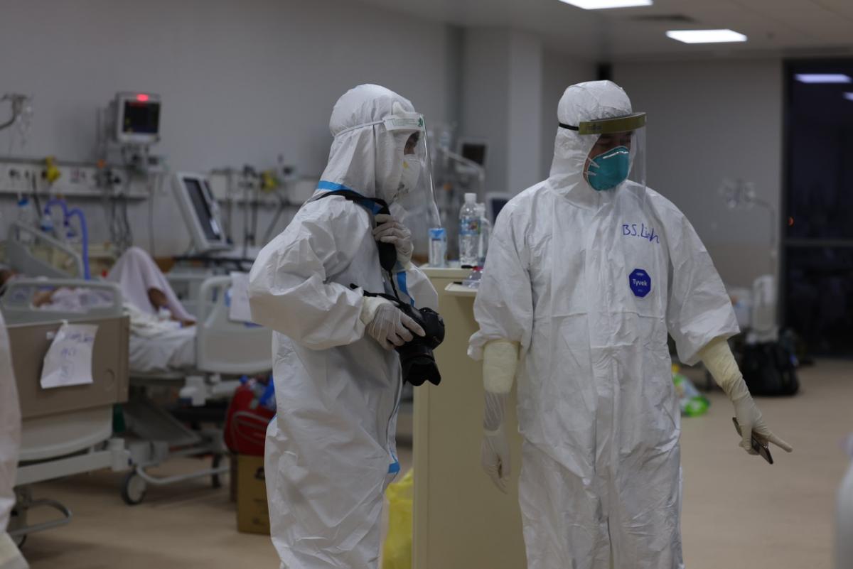 Phóng viên Hải Long – Báo điện tử Dân Trí tác nghiệp trong đêm cùng các y bác sỹ Bệnh viện hồi sức cấp cứu Covid-19. Anh vẫn nhớ mãi hình ảnh một số nhân viên y tế thấm mệt sau nhiều giờ làm việc căng thẳng, họ dựa tạm vào tường để nghỉ ngơi trong chốc lát. Hay hình ảnh bác sĩ Trần Thanh Linh lặng lẽ bước đi dưới ánh đèn leo lắt dọc hành lang bệnh viện sau nhiều tiếng điều trị cho các bệnh nhân. Ảnh: NVCC