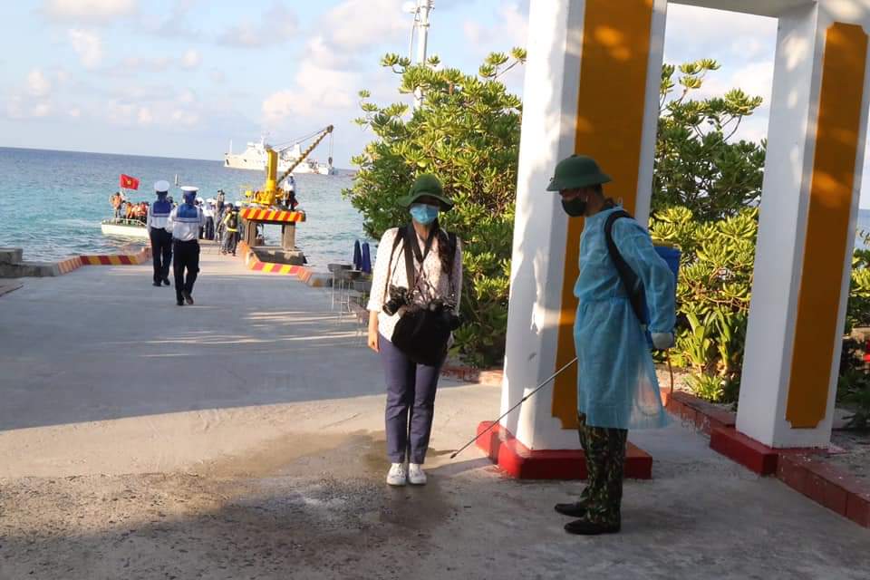 Không chỉ trên đất liền, tác nghiệp ở Trường Sa việc phòng dịch luôn được duy trì, ngoài việc chăm sóc sức khỏe trước khi ra huyện đảo, phóng viên còn phải tuân thủ các biện pháp phòng chống dịch. Trong ảnh nhà báo Nguyện Ánh - Báo Hànộimới lần tác nghiệp ở Trường Sa năm 2021. Ảnh: Cảnh Huệ