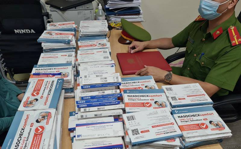 Cơ quan công an thu giữ các bộ kit test nhanh Covid-19 nhập lậu.