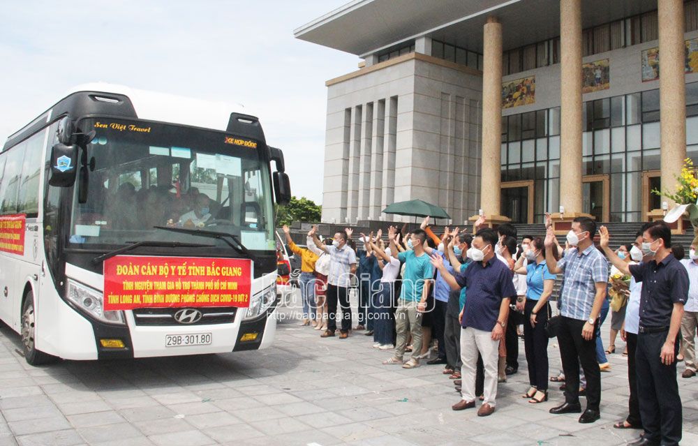 Ngày 30/8, 91 cán bộ, nhân viên y tế của tỉnh Bắc Giang tiếp tục vào hỗ trợ TP Hồ Chí Minh và các tỉnh Bình Dương, Long An. Đây đều là những cán bộ, bác sĩ, điều dưỡng, kỹ thuật viên có chuyên môn, kinh nghiệm chống dịch trong thời điểm dịch Covid-19 càn quét tỉnh Bắc Giang vừa qua đang làm việc tại các chuyên khoa: Hồi sức cấp cứu, Truyền nhiễm, Hô hấp, Nội khoa, Ngoại sản, Kiểm soát nhiễm khuẩn.