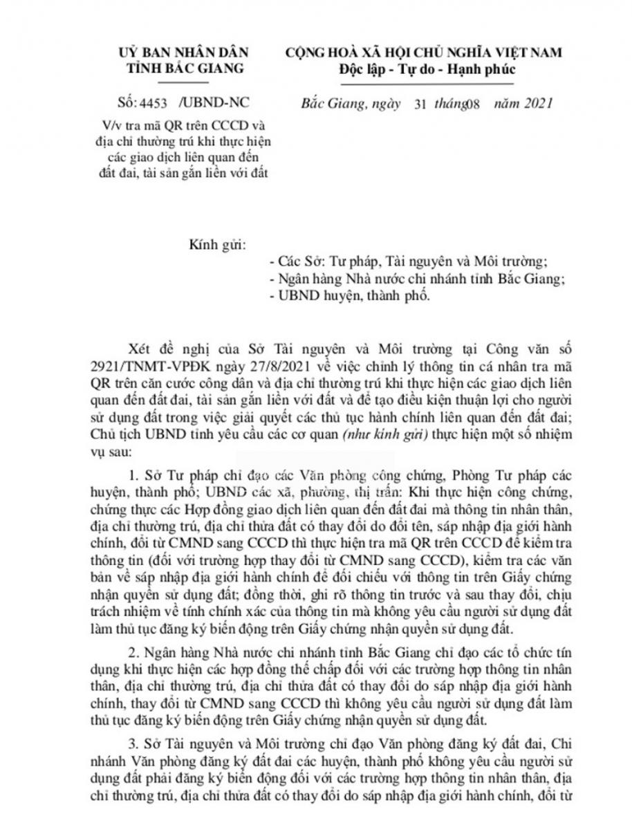 Để tạo điều kiện thuận lợi cho người sử dụng đất trong giải quyết các thủ tục hành chính liên quan đến đất đai, UBND tỉnh Bắc Giang vừa ban hành Công văn số 4453 ngày 31/8/2021 về tra mã QR trên căn cước công dân (CCCD) và địa chỉ thường trú khi thực hiện các giao dịch liên quan đến đất đai, tài sản gắn liền với đất.