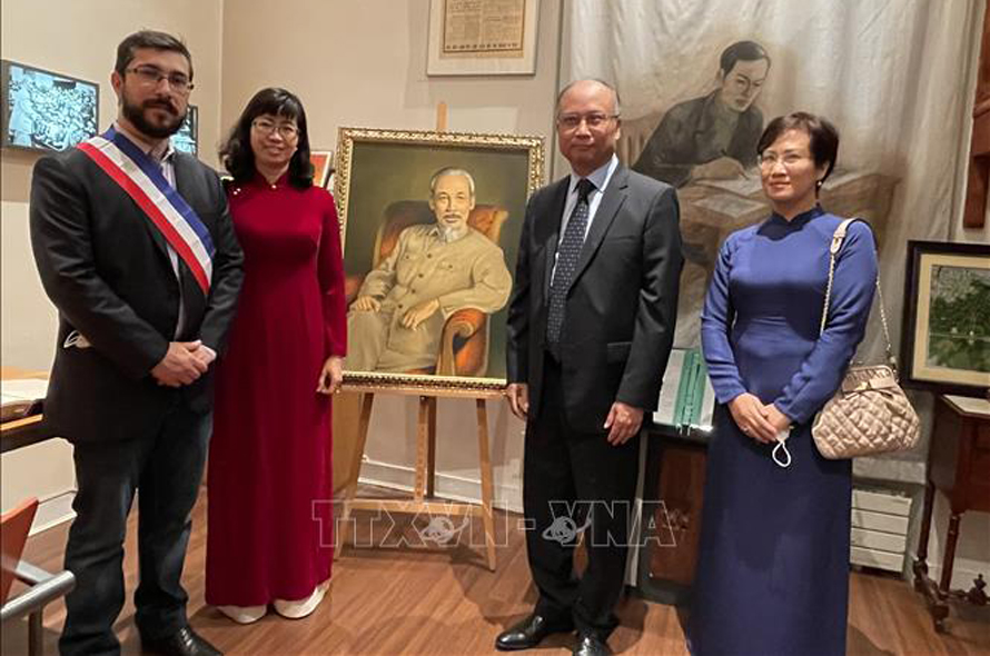 Đại sứ Việt Nam tại Pháp Đinh Toàn Thắng và phu nhân, Đại sứ - Trưởng Phái đoàn thường trực Việt Nam bên cạnh UNESCO Lê Thị Hồng Vân và Phó thị trưởng Montreuil Florian Vigneron thăm “Không gian Hồ Chí Minh” trong Bảo tàng Lịch sử Sống Montreuil. Ảnh: Nguyễn Thu Hà/Pv TTXVN tại Pháp