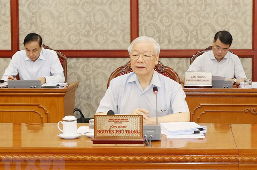 Tổng Bí thư Nguyễn Phú Trọng phát biểu kết luận cuộc họp. (Ảnh: TTXVN)