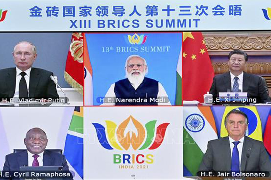 Ngày 9/9/2021, Thủ tướng Ấn Độ Narendra Modi (giữa, hàng trên) chủ trì Hội nghị thượng đỉnh Khối các nền kinh tế mới nổi hàng đầu thế giới (BRICS) lần thứ 13 theo hình thức trực tuyến. Ảnh: THX/TTXVN
