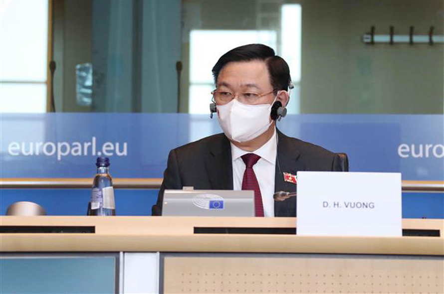 Chủ tịch Quốc hội Vương Đình Huệ làm việc với Chủ tịch Ủy ban Thương mại quốc tế Nghị viện châu Âu. Ảnh: Doãn Tấn/TTXVN