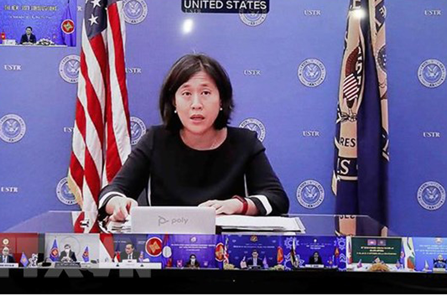 Đại diện Thương mại Hoa Kỳ (USTR), bà Katherine Tai phát biểu tại điểm cầu Washington D.C. (Ảnh: Trần Việt/TTXVN)