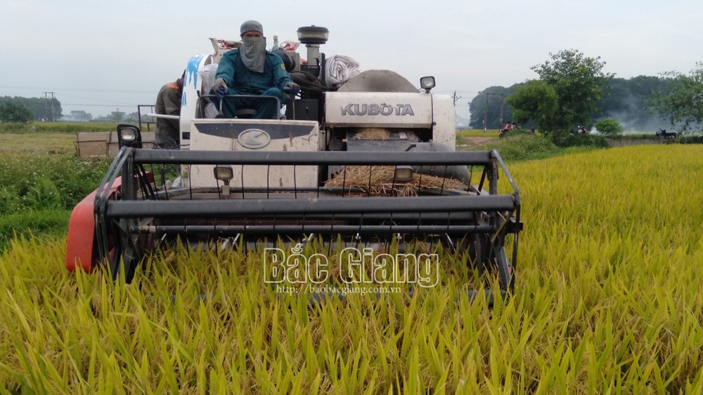 Nông dân xã Tiến Dũng (Yên Dũng) tham gia dự án thu hoạch lúa.