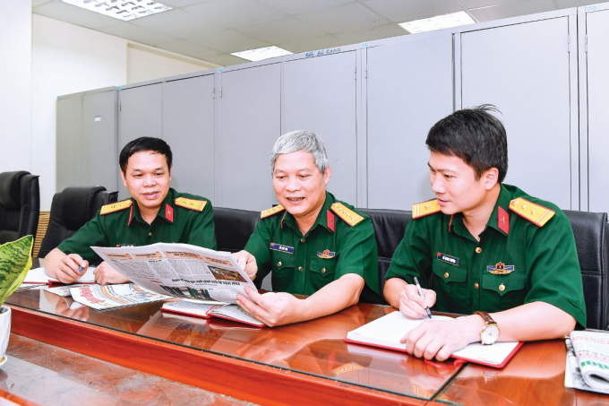 Nhóm phóng viên Báo Quân đội nhân dân trao đổi nội dung thể hiện loạt bài viết, từ phải sang trái: Trung tá Hồ Quang Phương, Đại tá Đỗ Phú Thọ, Trung tá Nguyễn Chiến Thắng. Ảnh: Tuấn Huy