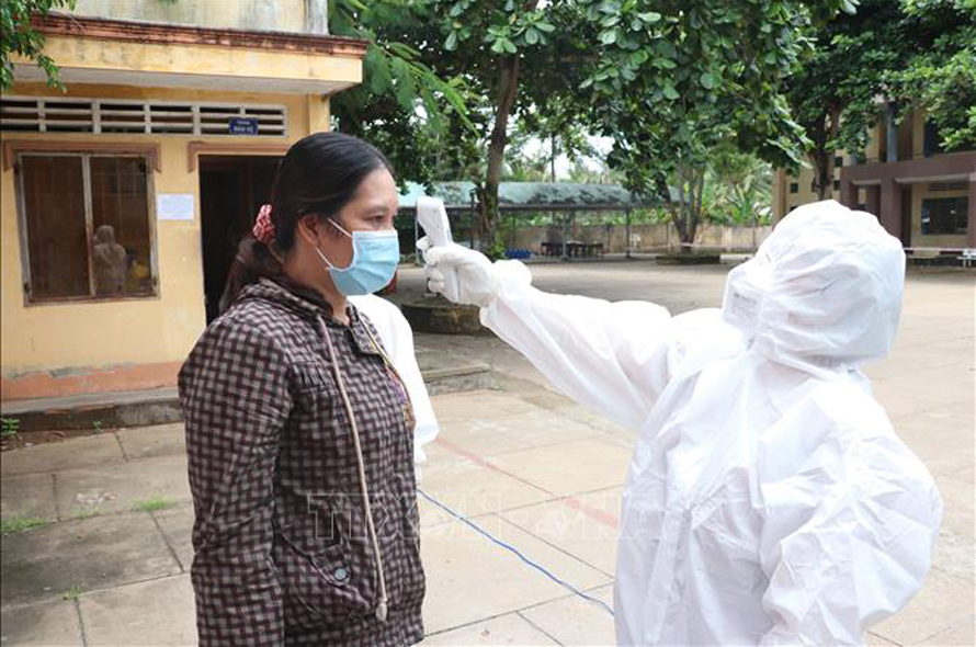 Công dân tỉnh Bến Tre đo nhiệt độ trước khi vào khu cách ly. Ảnh: Huỳnh Phúc Hậu/TTXVN