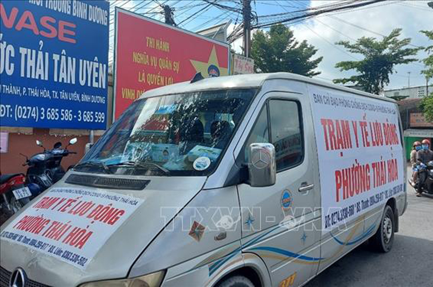 Trạm y tế lưu động trên địa bàn phường Thái Hòa, thị xã Tân Uyên, tỉnh Bình Dương. Ảnh: TTXVN phát