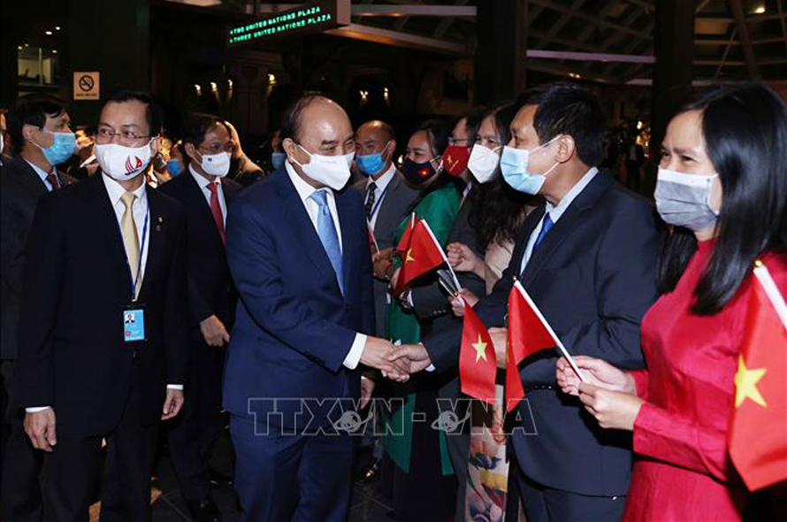 Cán bộ Đại sứ quán tại Hoa Kỳ và Phái đoàn thường trực Việt Nam tại Liên hợp quốc đón Chủ tịch nước Nguyễn Xuân Phúc. Ảnh: Thống Nhất/TTXVN