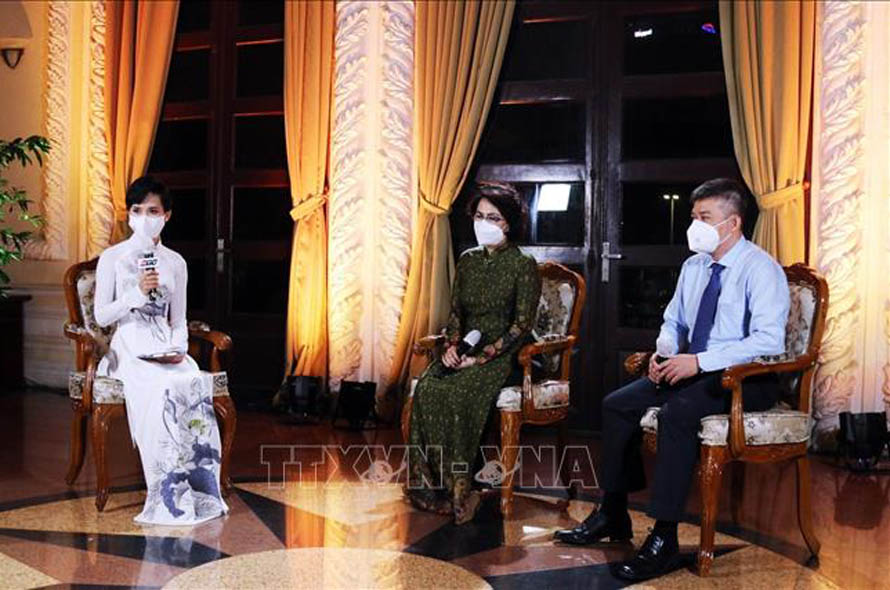 Chủ tịch Uỷ ban MTTQ Việt Nam Thành phố Hồ Chí Minh Tô Thị Bích Châu (ở giữa) và bác sỹ Trần Thanh Linh giao lưu tại chương trình. Ảnh: Xuân Khu/TTXVN
