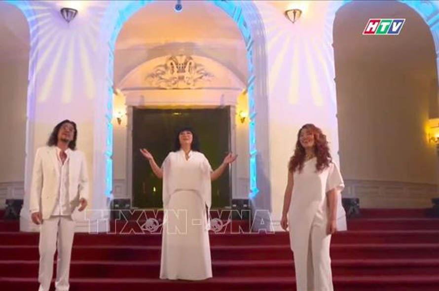 Tiết mục "Sài Gòn tôi sẽ" do nghệ sĩ Khắc Triệu, Cẩm Vân và Cece Trương thể hiện (ảnh chụp màn hình). Ảnh: Thu Hương/TTXVN