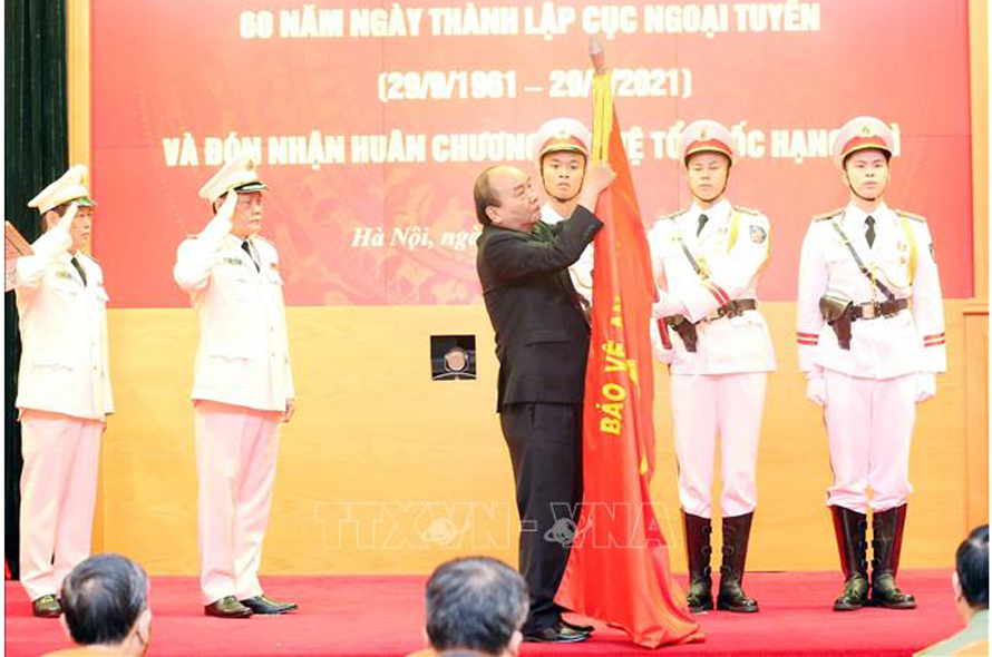 Chủ tịch nước Nguyễn Xuân Phúc gắn Huân chương Bảo vệ Tổ quốc hạng Nhì lên cờ truyền thống của Cục Ngoại tuyến. Ảnh: Phạm Kiên/TTXVN