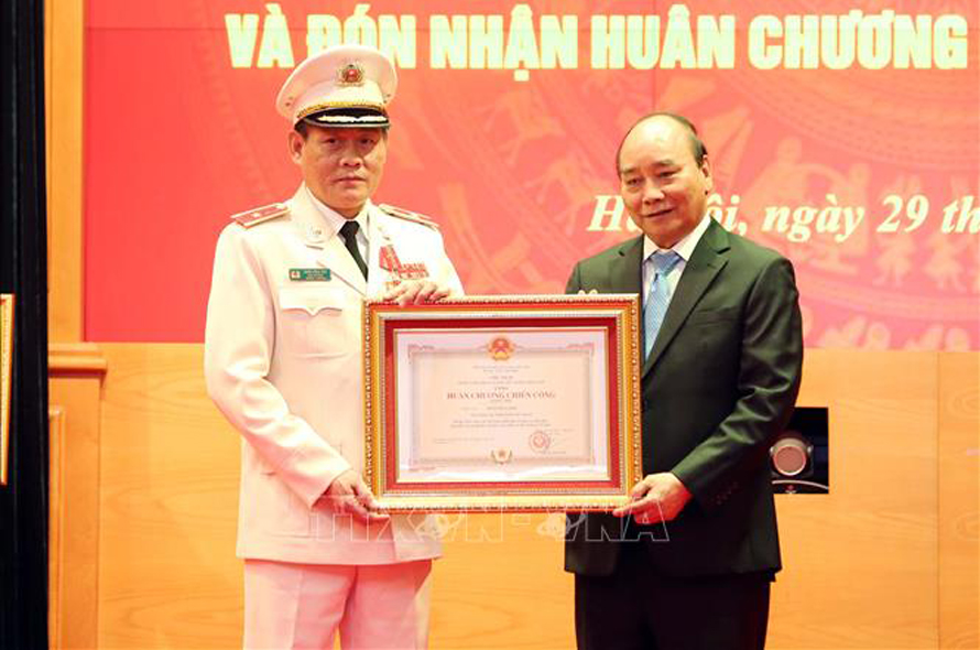 Chủ tịch nước Nguyễn Xuân Phúc trao Huân chương Bảo vệ Tổ quốc hạng Nhì tặng Cục Ngoại tuyến, Bộ Công an. Ảnh: Phạm Kiên/TTXVN