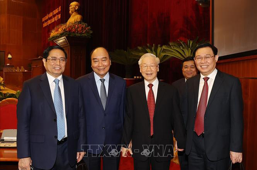 Tổng Bí thư Nguyễn Phú Trọng, Chủ tịch nước Nguyễn Xuân Phúc,Thủ tướng Chính phủ Phạm Minh Chính, Chủ tịch Quốc hội Vương Đình Huệ cùng các đồng chí lãnh đạo Đảng, Nhà nước dự bế mạc Hội nghị. Ảnh: Trí Dũng/TTXVN