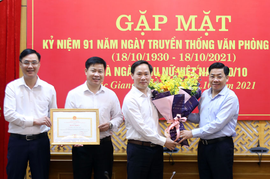 Thừa ủy quyền của Bí thư T.Ư Đảng, Chánh Văn phòng T.Ư Đảng, đồng chí Bí thư Tỉnh ủy trao Bằng khen của Chánh Văn phòng T.Ư Đảng, tặng hoa chúc mừng tập thể Văn phòng Tỉnh ủy.