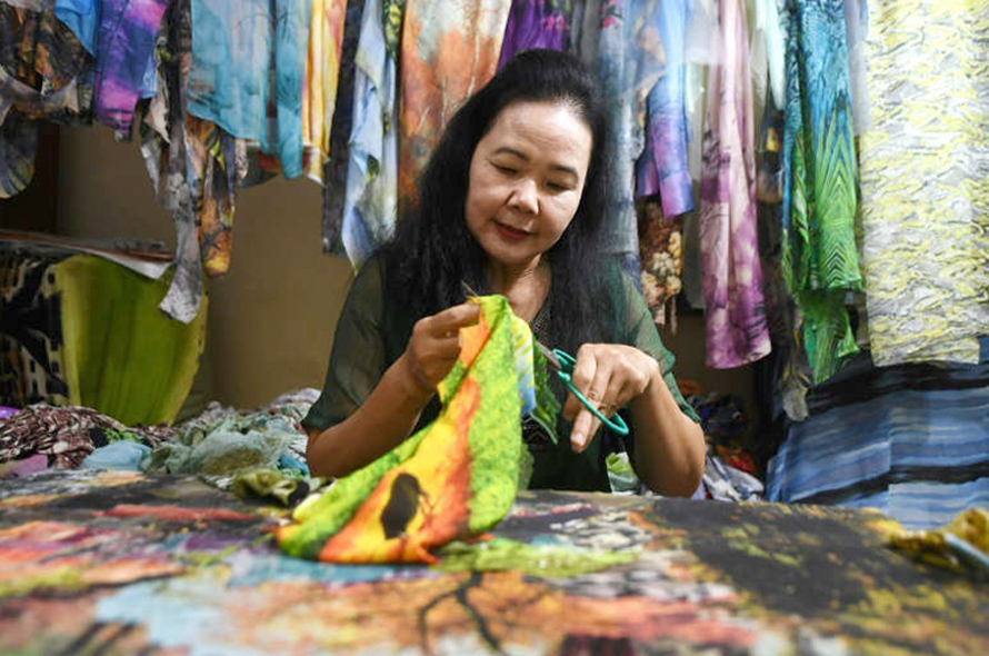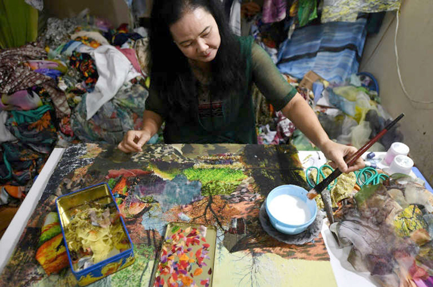 Trong căn phòng ở Hà Nội, bà Tran Thanh Thuc cắt một tấm khăn lụa nhỏ thành những mảnh nhỏ để dán lên các tác phẩm nghệ thuật của mình.