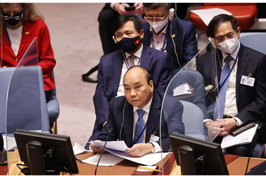 Chủ tịch nước Nguyễn Xuân Phúc tham dự và phát biểu tại một phiên họp cấp cao của Hội đồng Bảo an Liên hợp quốc. (Ảnh TTXVN).