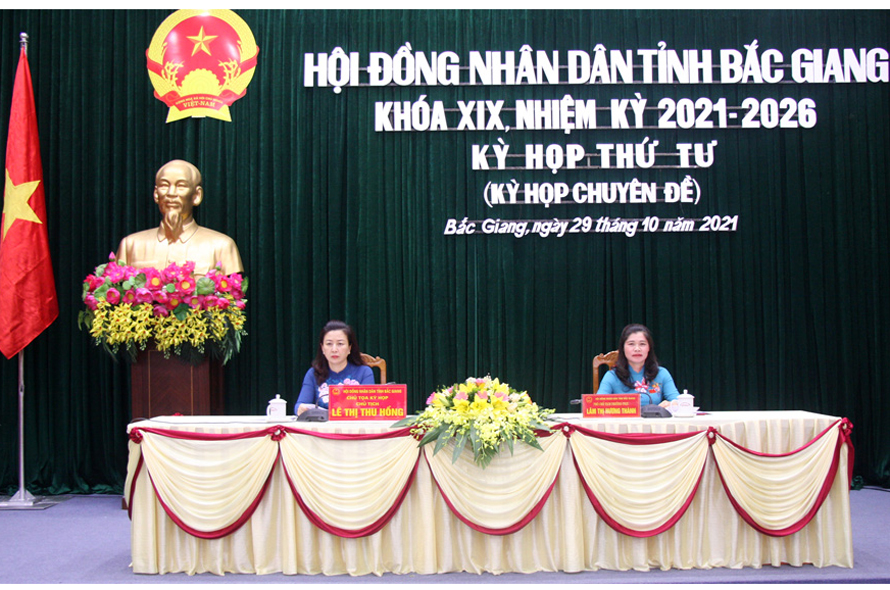 Ngày 29/10, tại Trung tâm Hội nghị tỉnh, HĐND tỉnh Bắc Giang khóa XIX, nhiệm kỳ 2021- 2026 tổ chức kỳ họp thứ 4 (kỳ họp chuyên đề). Các đồng chí: Lê Thị Thu Hồng, Phó Bí thư Thường trực Tỉnh ủy, Chủ tịch HĐND tỉnh; Lâm Thị Hương Thành, Phó Chủ tịch Thường trực HĐND tỉnh chủ tọa kỳ họp.