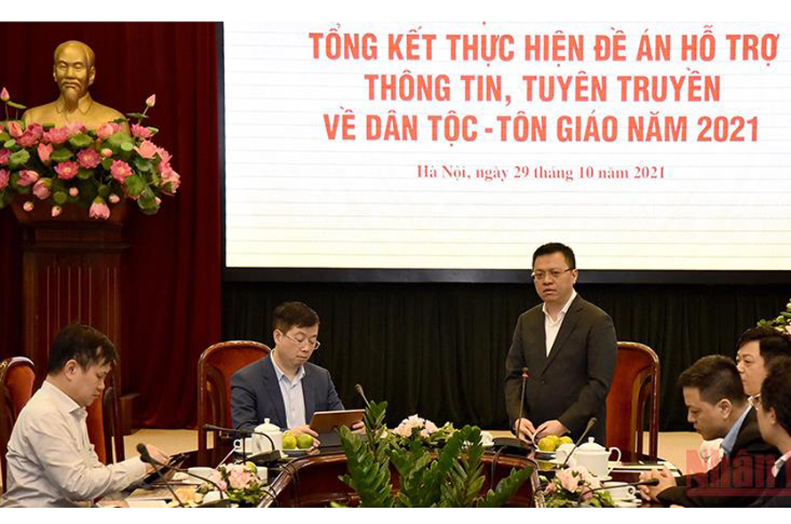 Chiều 29/10, Báo Nhân Dân phối hợp Bộ Thông tin và Truyền thông tổ chức Hội thảo tổng kết thực hiện Đề án hỗ trợ thông tin, tuyên truyền về dân tộc - tôn giáo năm 2021 nhằm đánh giá kết quả thực hiện nhiệm vụ, công tác tuyên truyền, công tác xuất bản Phụ trương Dân tộc - Tôn giáo trên ấn phẩm Nhân Dân cuối tuần năm 2021; đồng thời đề ra giải pháp giúp việc tuyên truyền và xuất bản hiệu quả hơn đối với lĩnh vực dân tộc - tôn giáo trong các năm tiếp theo.