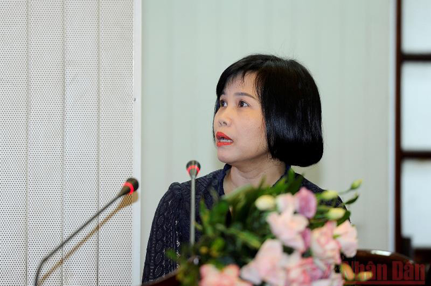 Đồng chí Trần Thị Kiều Thanh Bình, Giám đốc Trung tâm Thông tin (đơn vị đầu mối tổ chức) báo cáo kết quả thực hiện Đề án thông tin, tuyên truyền về Dân tộc - Tôn giáo năm 2021 của Báo Nhân Dân. Ảnh: ĐĂNG KHOA