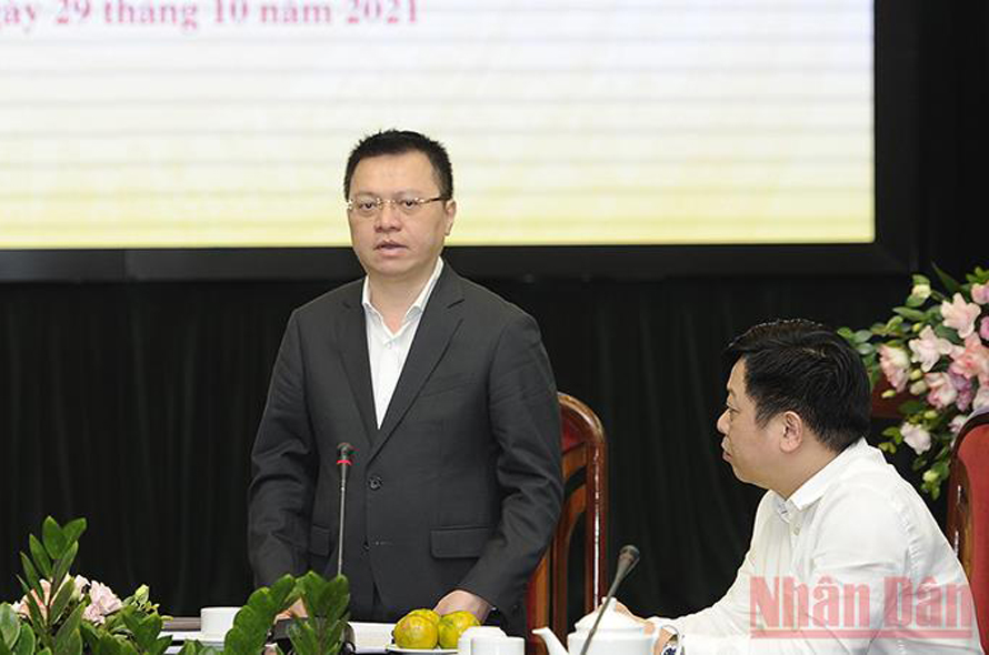 Đồng chí Vũ Mai Hoàng, Trưởng ban Nhân Dân cuối tuần, đơn vị thực hiện xuất bản Phụ trương Dân tộc - Tôn giáo năm 2021 trên ấn phẩm Nhân Dân cuối tuần, phát biểu ý kiến tiếp thu chia sẻ, đóng góp của các chuyên gia. Ảnh: ĐĂNG KHOA