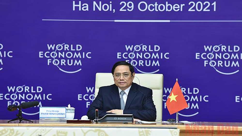 Ngay sau phát biểu của Giáo sư Klaus Schwab, Thủ tướng Chính phủ Phạm Minh Chính đã có bài phát biểu quan trọng với thông điệp chính sách mạnh mẽ, khẳng định nỗ lực và quyết tâm của Việt Nam về phục hồi, phát triển kinh tế - xã hội, thực hiện tầm nhìn, mục tiêu và khát vọng phát triển đất nước.
