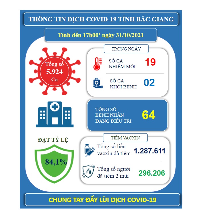 Theo Ban chỉ đạo phòng, chống dịch COVID-19 tỉnh, đến 17h00’ ngày 31/10/2021, trên địa bàn tỉnh Bắc Giang ghi nhận 19 ca mắc mới COVID-19 (trường hợp F0). Tính đến nay, toàn tỉnh có 5.924 trường hợp F0.