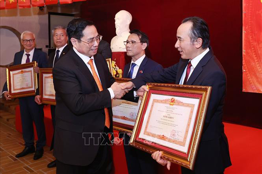Thủ tướng Phạm Minh Chính tặng Bằng khen cho các kiều bào có thành tích trong công tác phòng, chống dịch. Ảnh: Dương Giang/TTXVN