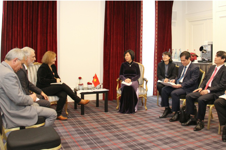 Phó Trưởng ban Đối ngoại Trung ương Nguyễn Thị Hoàng Vân gặp Trưởng Ban Đối ngoại Đảng Cộng sản Pháp Lydia Samarbakhsh.