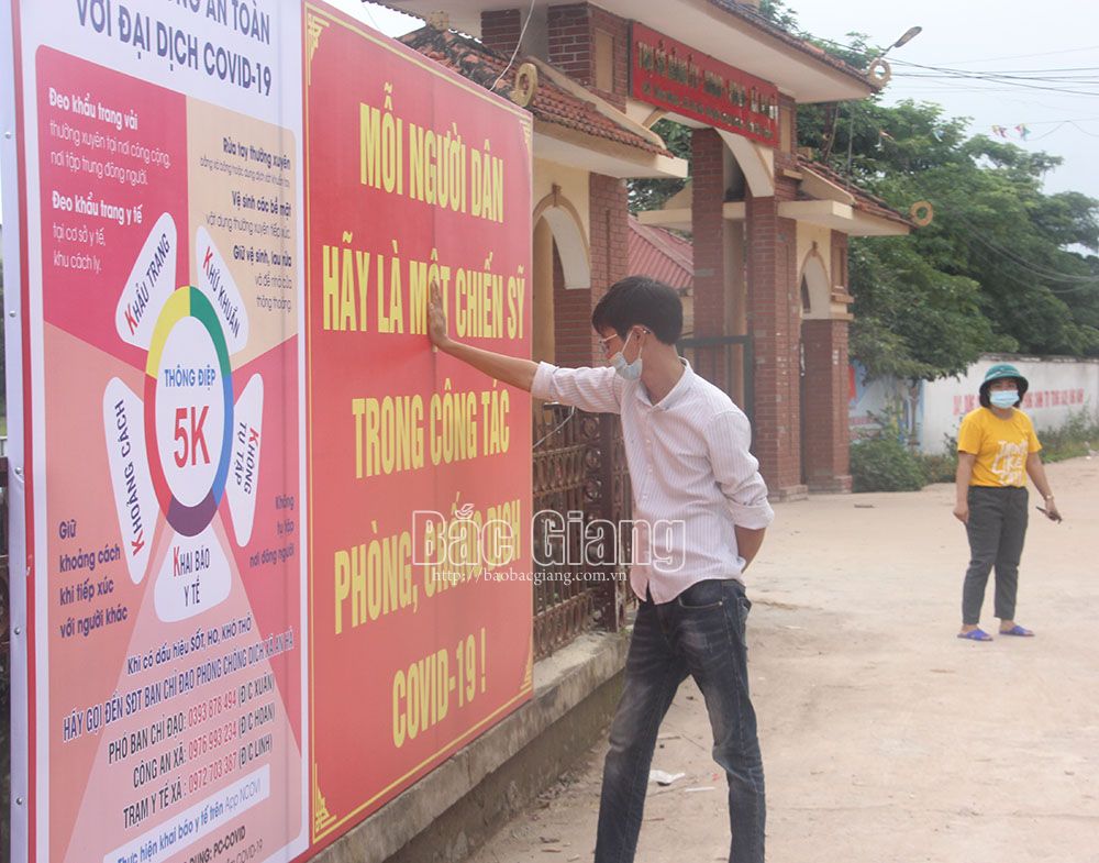 Đoàn viên thanh niên xã An Hà, huyện Lạng Giang treo biển tuyên truyền phòng, chống dịch. |