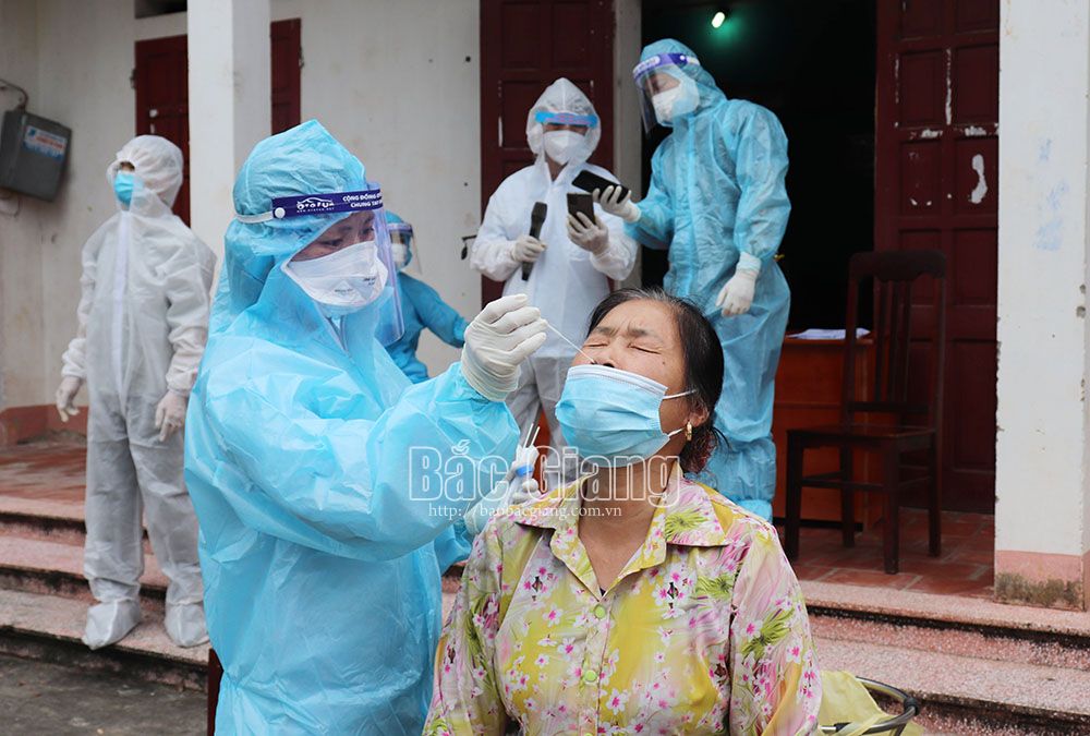 Cán bộ Trung tâm Y tế huyện Lạng Giang lấy mẫu xét nghiệm Covid-19 cho người dân xã An Hà. |