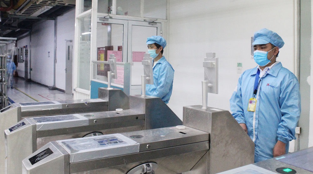 Công nhân Công ty TNHH Fuhong Precision Component, KCN Đình Trám được đo thân nhiệt tự động trước khi vào phân xưởng.