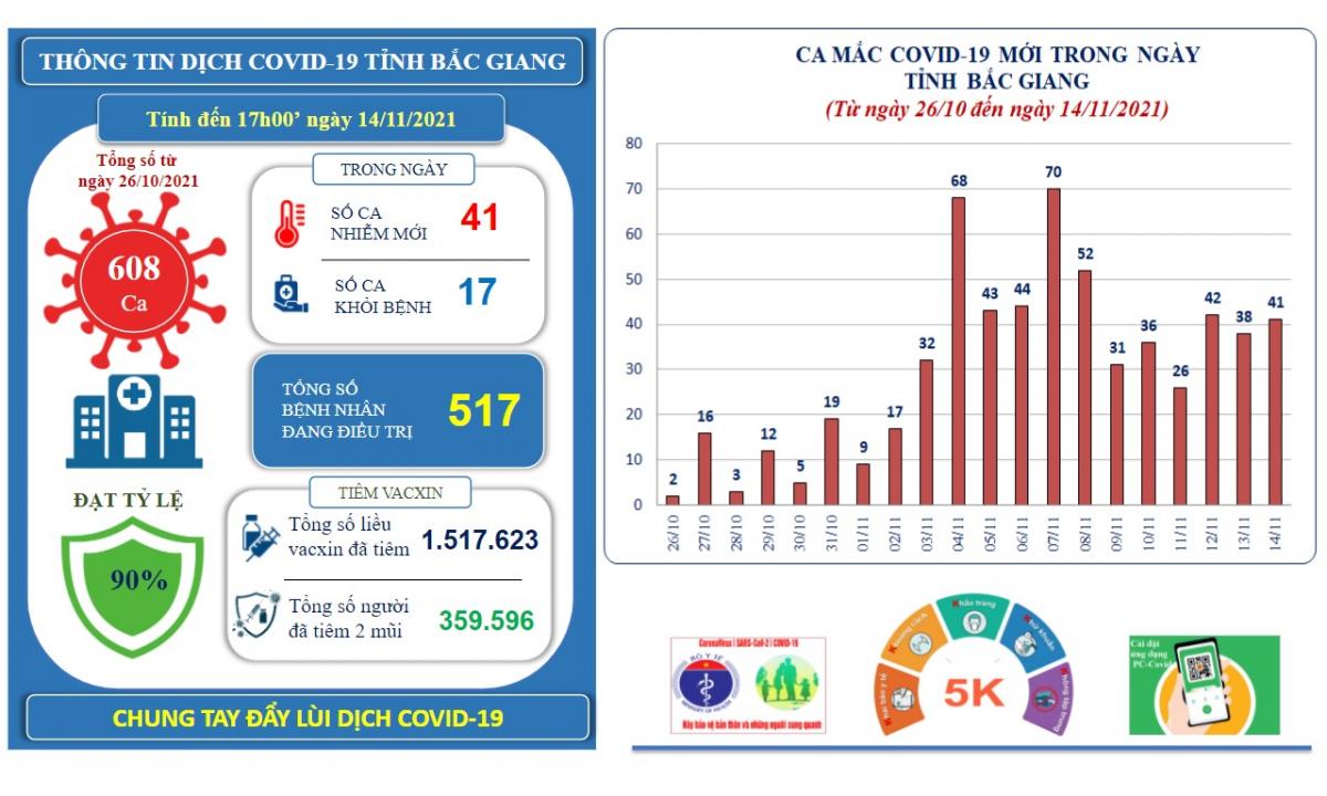 Theo Sở Y tế, đến 17h00’ ngày 14/11/2021, trên địa bàn tỉnh Bắc Giang ghi nhận 41 ca mắc mới COVID-19 (ca F0). Như vậy, từ ngày 26/10/2021 đến nay, trên địa bàn tỉnh đã ghi nhận 608 ca F0. Cụ thể: