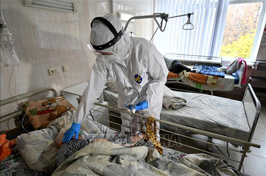 Nhân viên y tế điều trị cho bệnh nhân COVID-19 tại bệnh viện ở Kiev, Ukraine. Ảnh: AFP/TTXVN