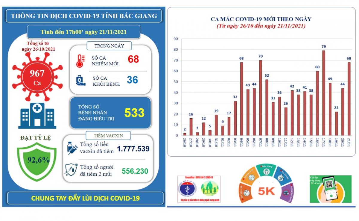 Theo Sở Y tế, đến 17h00’ ngày 21/11/2021, trên địa bàn tỉnh Bắc Giang ghi nhận 68 ca mắc mới COVID-19 (ca F0). Như vậy, từ ngày 26/10/2021 đến nay, trên địa bàn tỉnh đã ghi nhận 967 ca F0. Cụ thể: